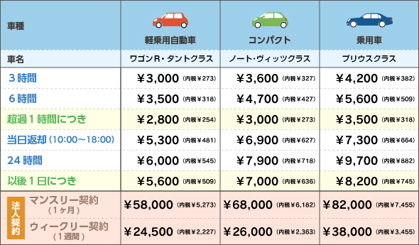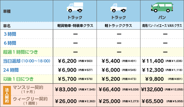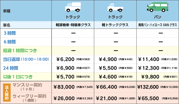 ※超過時間の適用は当日(営業時間内)で3~6時間の貸出契約に適用され、営業時間を超過された場合は以後1日の適用になります。