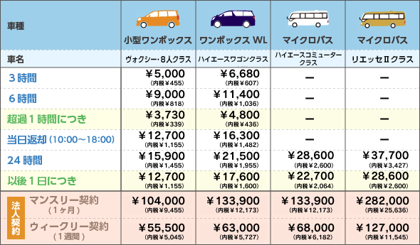 ※マイクロバス・ハイエースコミューターの貸し出し条件は24時間まで及び以後1日の適用となります。